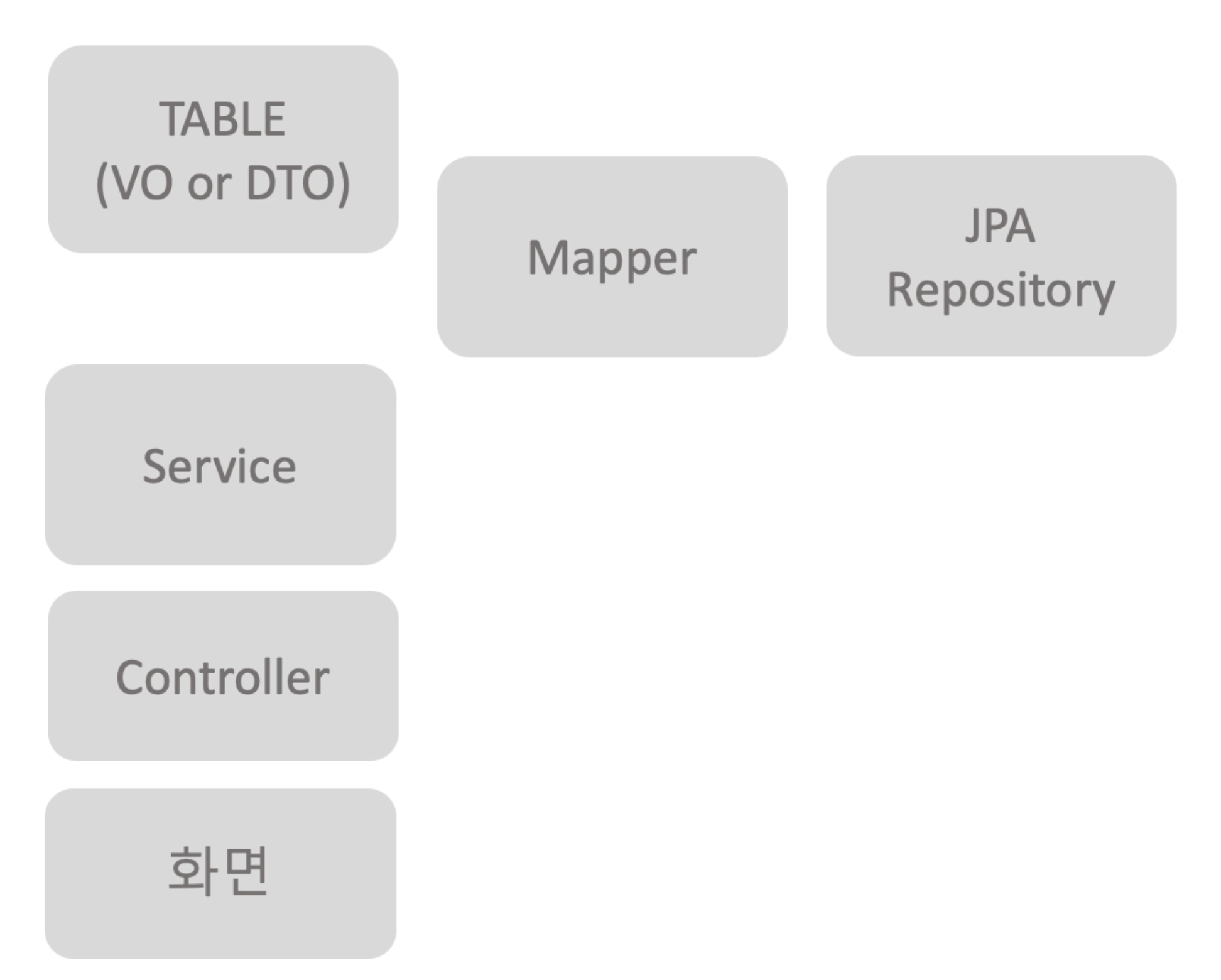 화면을 통해 들어온 요청은 Controller - Service 를 통해 어떤 처리를 할지 결정한다. 기존 ORM, Mybatis 의 경우에는 Mapper 를 통해서 테이블에 연동이 된다. VO 혹은 DTO 는 테이블 형태로 정의되어 실제 데이터베이스와 연결되어 있다.
